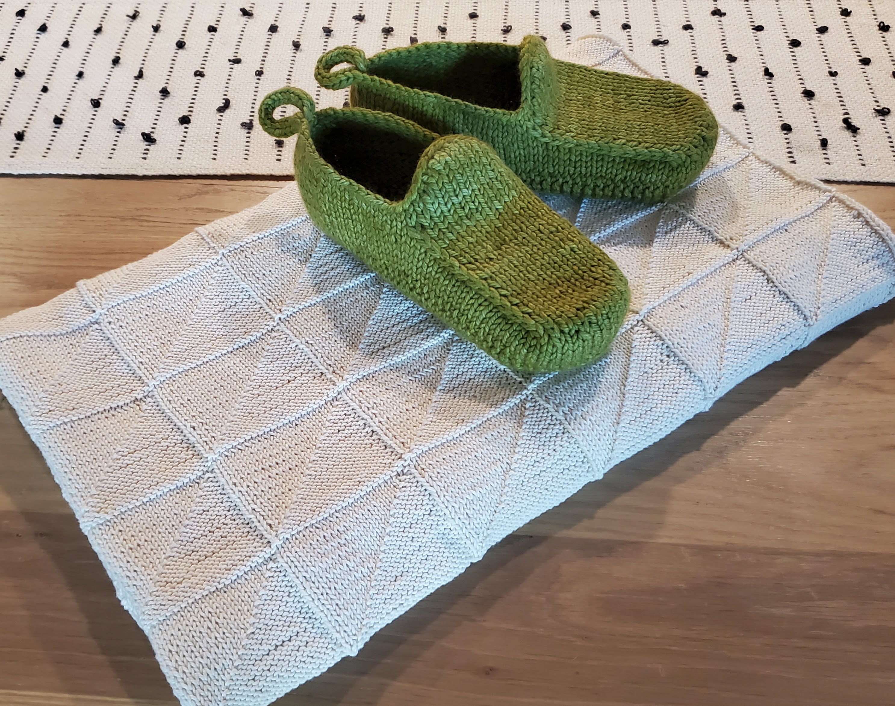 Check it out! I knitted some loafers! And finished the cotton triangles blanket. But, it’s going to have to go into the “hope chest” as in, I hope someday to have a clean house where chocolate milk and otter pop spills don’t happen on the hour.
