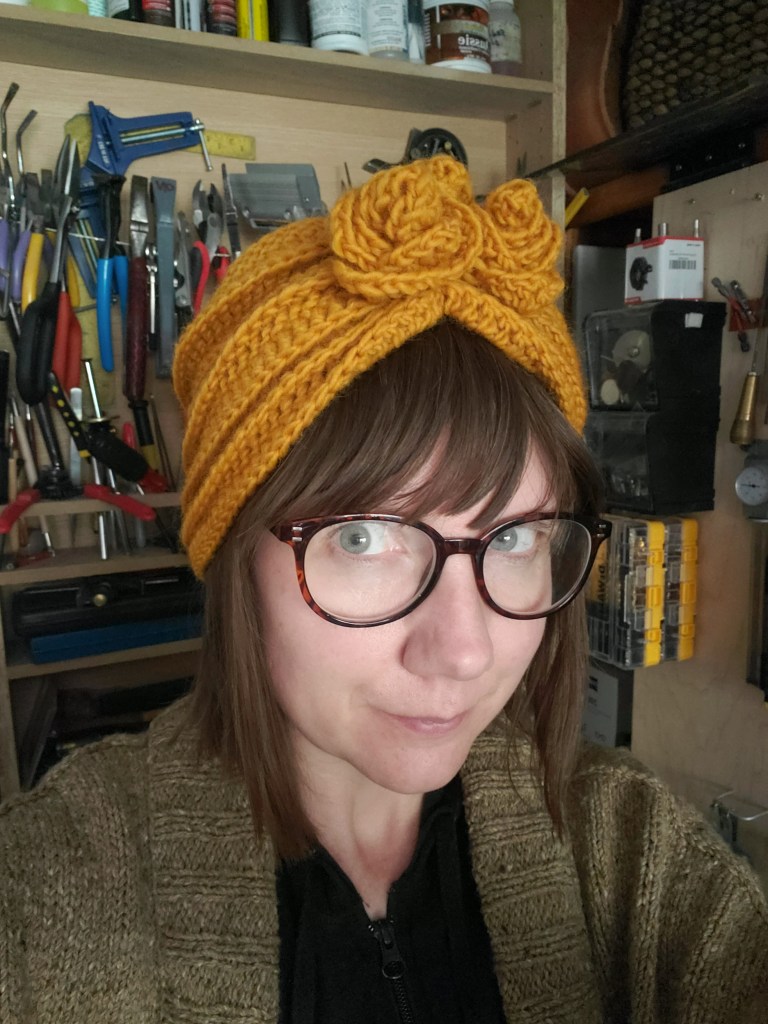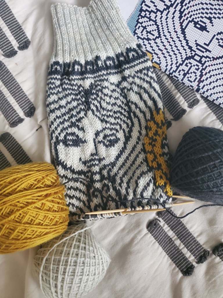 Crusin along on some knee socks. I was in the mood for an intense pattern. The look on her face is so bitchy. I got the pattern from Novita.com. The mustard yellow goes with this kindof silly turban I just crocheted that I’ll probably never wear-
