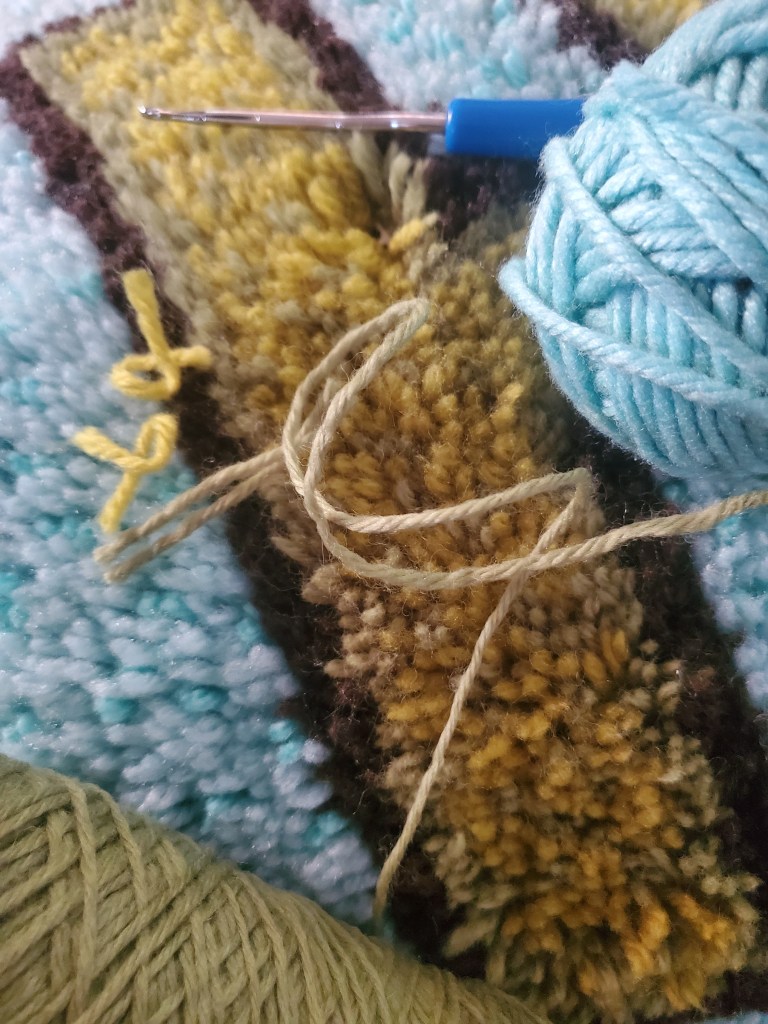 Double strands of wool filled in for all the missing baby poo yellow. Found some turquoise rug yarn on Etsy that was a pretty good match.